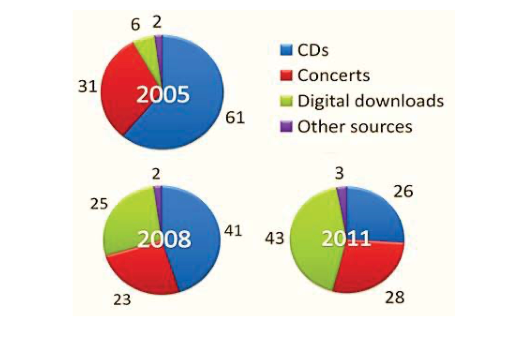 Looking at the pie charts in more details, Concerts were always popular in three all years of 2005, 2008 and 2011, and showed little fluctuation. Music spending in CDs was so high in 2005, started with 61% however, it gradually declined in the following years of 2008 and 2011, which ended up to 60%.