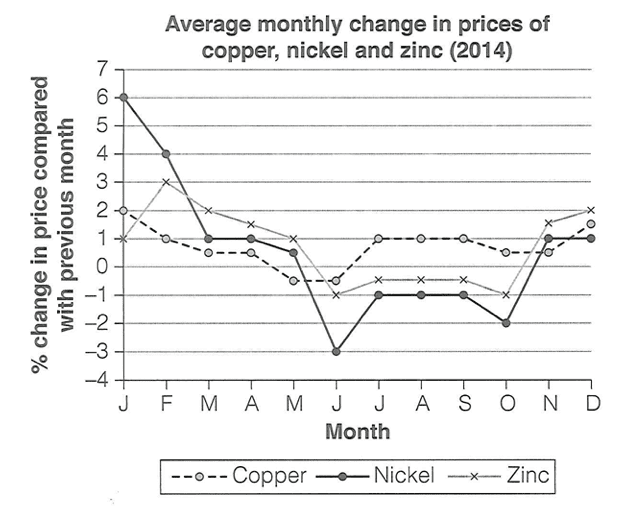 The graph below shows the average monthly change in the prices of three metals during 2014.