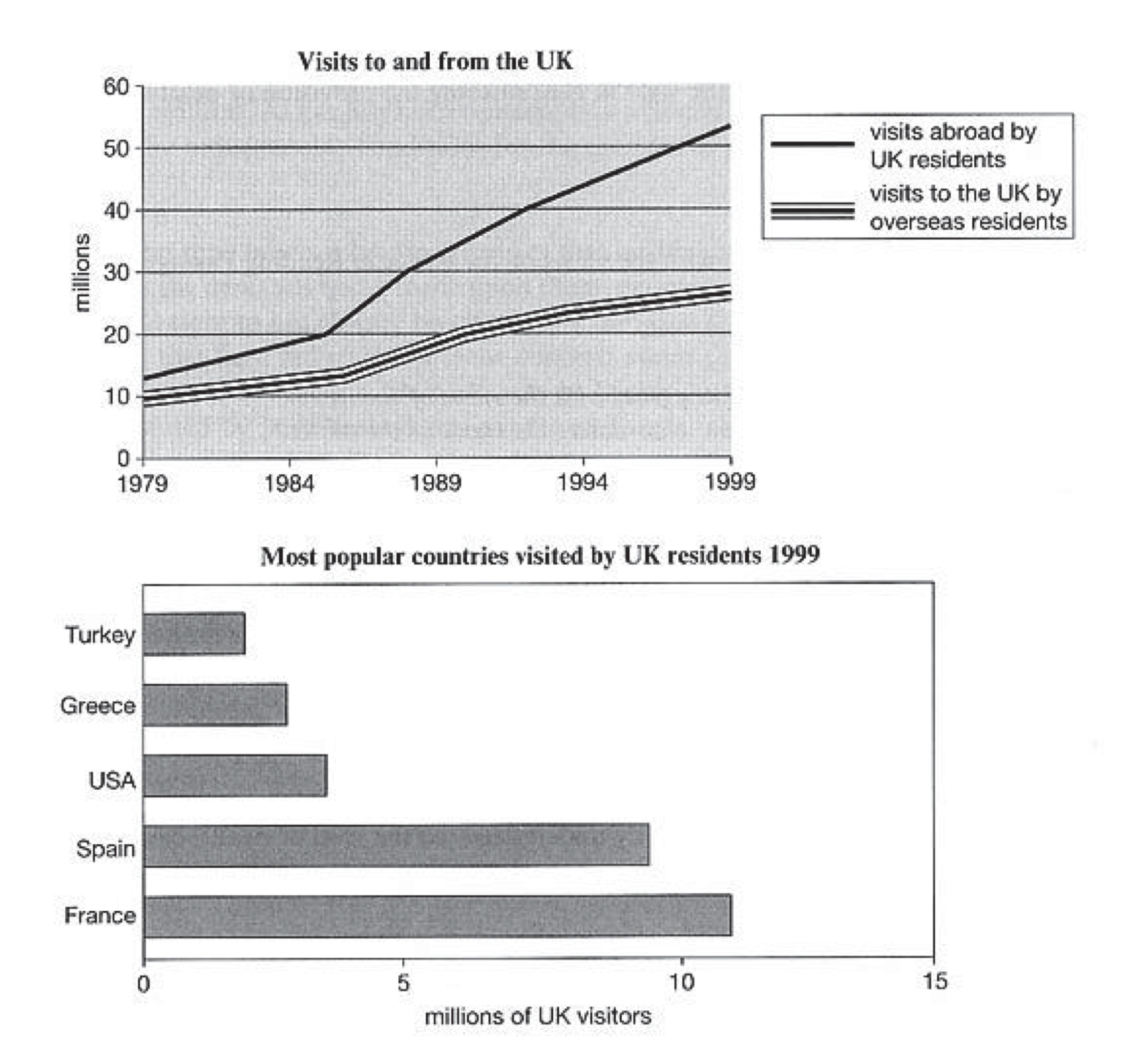 The line graph shows visits to and from the UK from 1979 to 1999, and the bar graph shows the most popular countries visited by UK residents in 1999