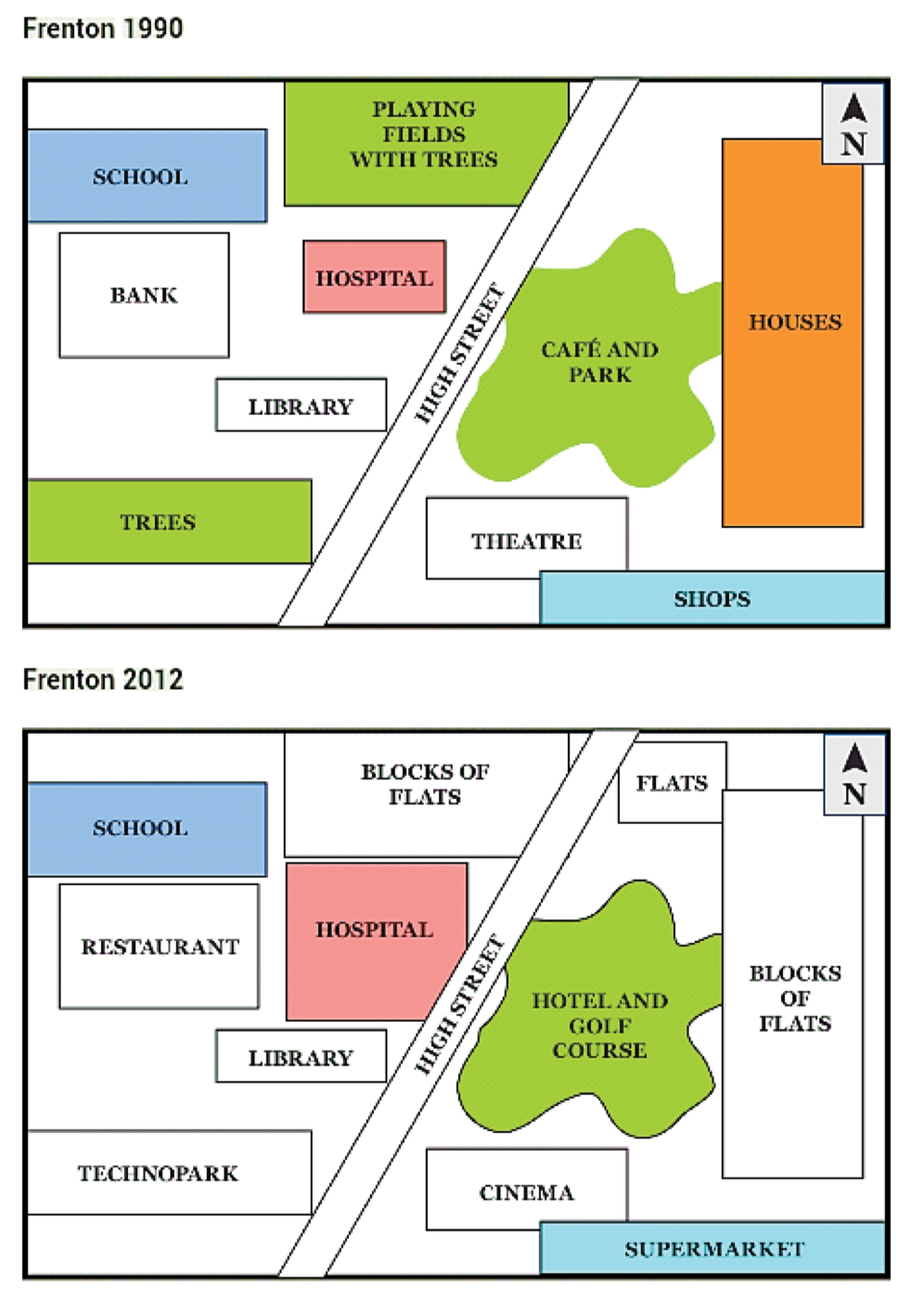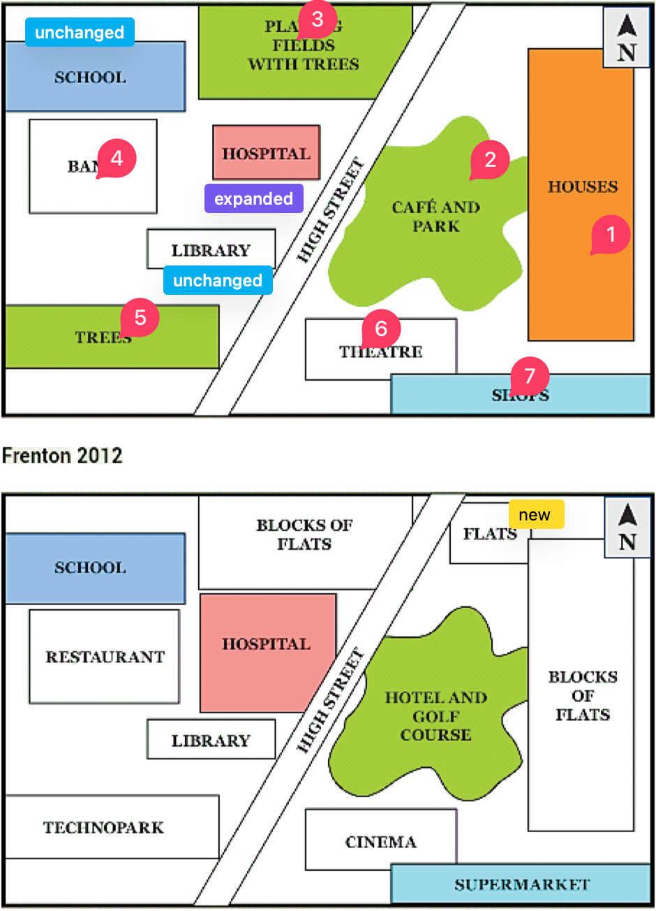 The map of the Frenton after proposed changes, looks distinctly different. The houses is expected to be changed with blocks of flats, along with this that close cafe and park is anticipated to transform in hotel and golf course. The hospital of the middle didn't change rather it renovated and expanded. The tree area of first map's south-west is removed and trurned to a technopark. After the school, the bank changed to restaurant. School and library remain untouched, whereas flats developer on the north-east.
