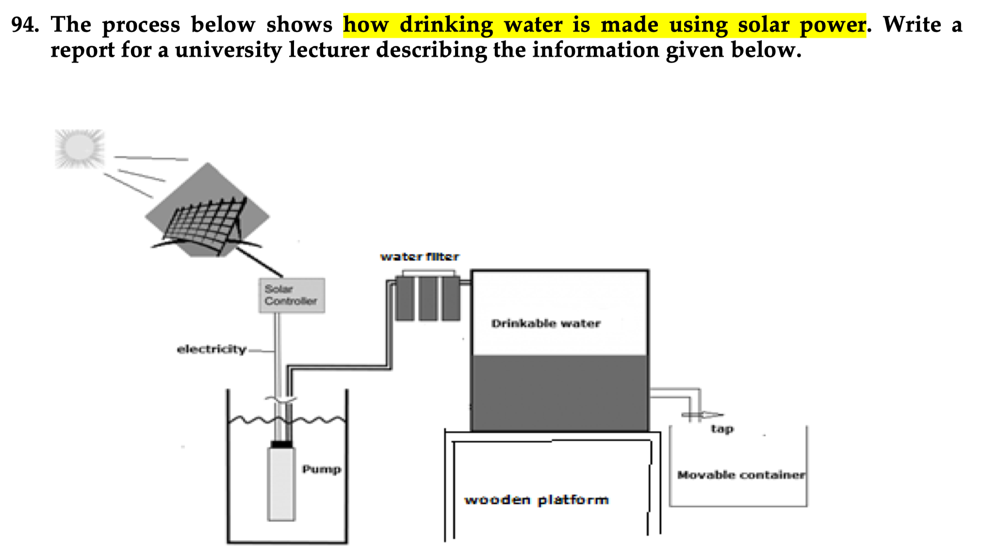 The process below shows how drinking water is made using solar power. Write a report for a university lecturer describing the information given below.
